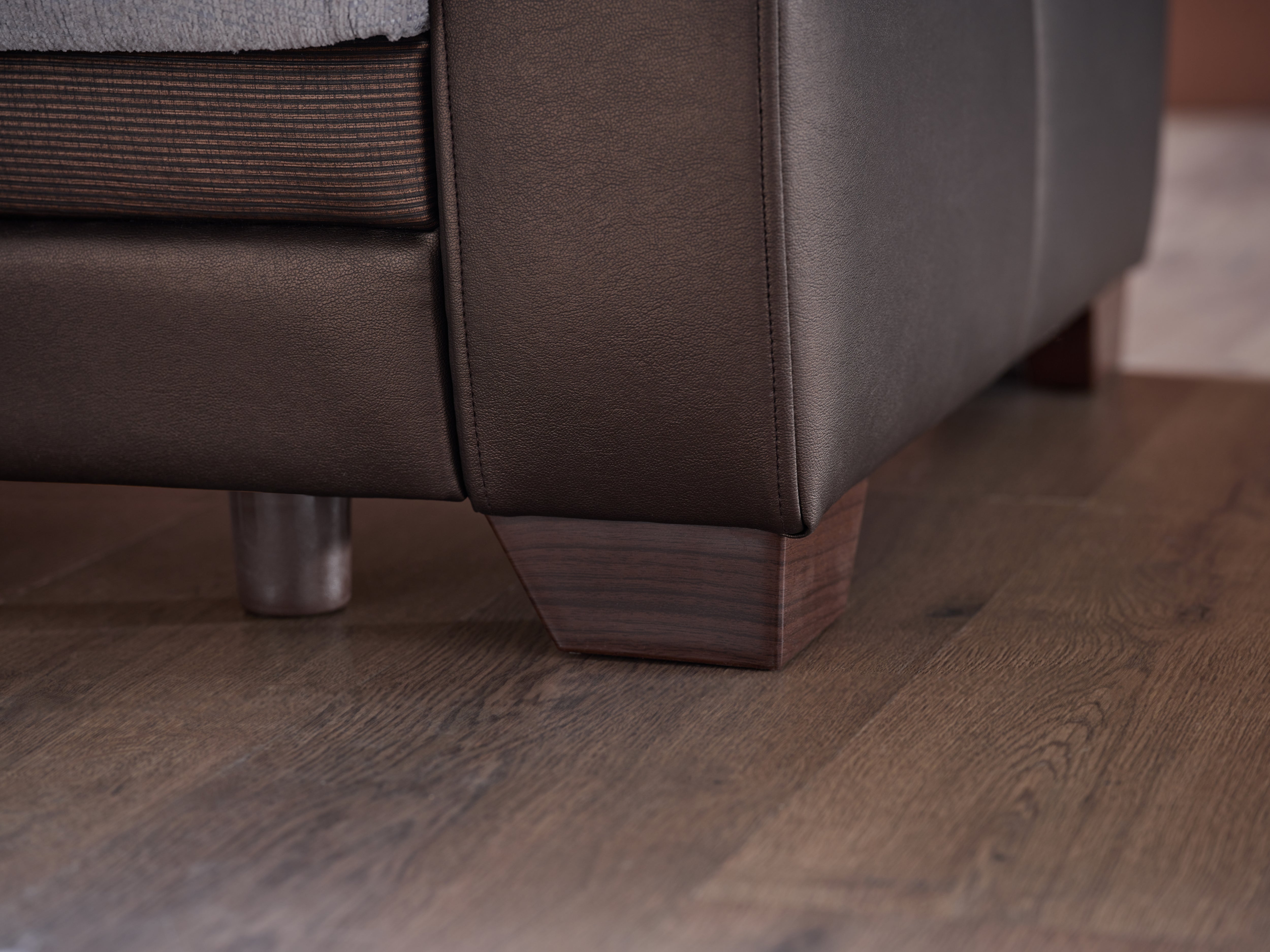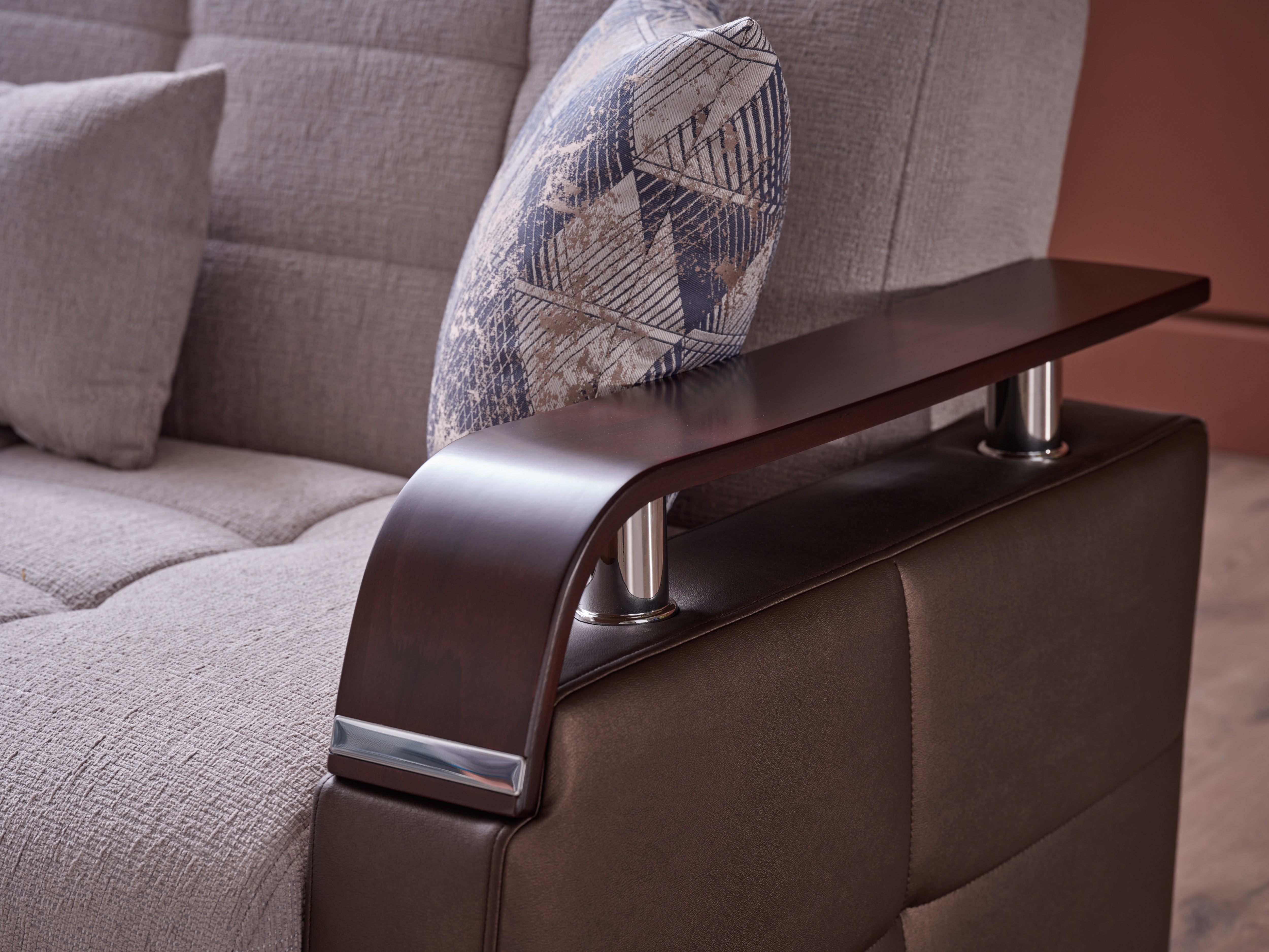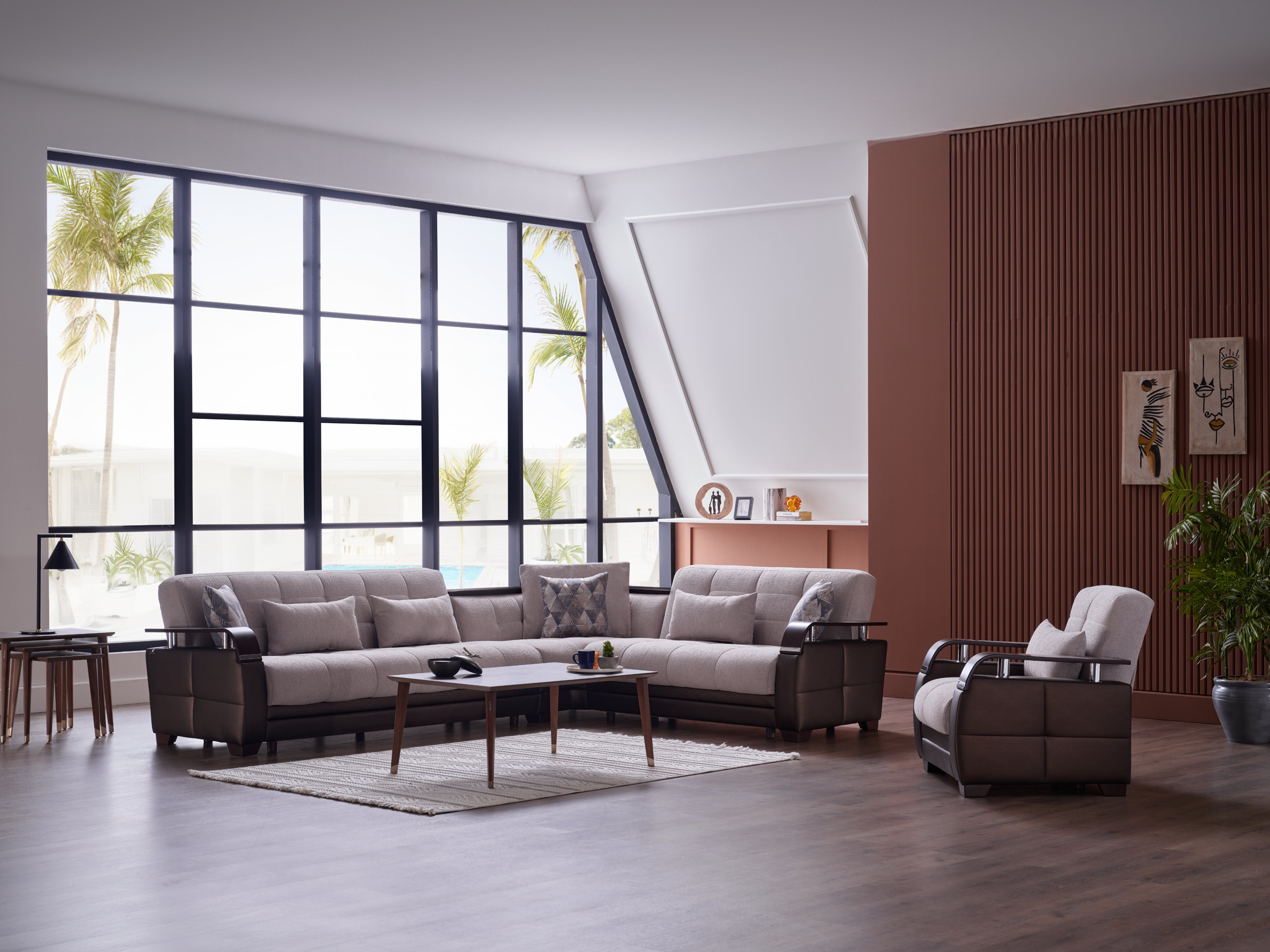Com um design contemporâneo e divertido e dimensões generosas, o sofá seccional Natural é perfeito para o coração da casa. Esta peça moderna apresenta apoios de braço elevados em madeira com detalhes cromados, um exterior em couro sintético combinado com um interior macio e aveludado, e um perfil curvilíneo atraente. Os assentos espaçosos com módulos nos cantos permitem reunir amigos e familiares. Este sofá seccional possui espaço de armazenamento oculto sob os assentos para facilitar a organização e duas camas dobráveis ​​que oferecem aos hóspedes um lugar aconchegante para passar a noite.