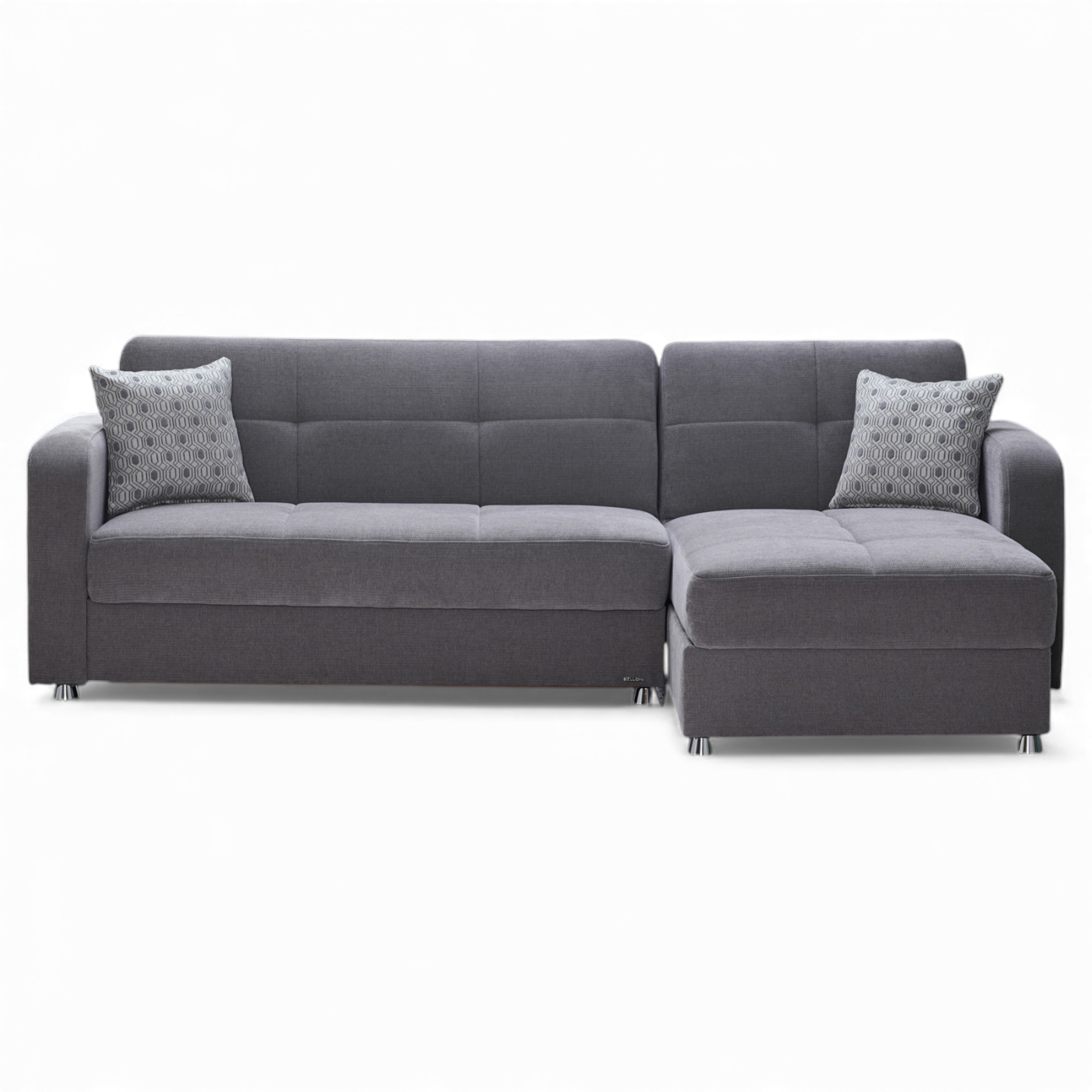 O sofá seccional Vision cria uma atmosfera acolhedora em qualquer espaço, convidando amigos e familiares a ficarem por mais tempo. Seu design moderno apresenta um atraente acabamento com botões, proporções arredondadas e elegantes pés cromados. Este sofá seccional com chaise oferece amplo espaço para toda a família e proporciona a conveniência de armazenamento embutido e uma cama dobrável.